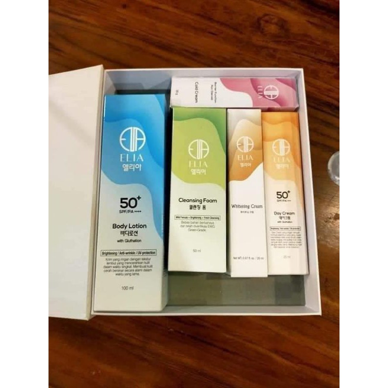 1 paket terdiri dari:1 btl cleansing foam1 btl cold cream1 btl day cream1 btl body lotion1 btl whitening cream*ELIA COLD CREAM*Multi purpose cream yang mengandung bahan natural ekstrak herbal yang membantu mengurangi gejala inflamasi(keradangan) yang menyebabkan kemerahan pada kulit (redness)*Manfaat Cold Cream* :1. Membantu mengatasi keradangan2. Membantu menyembuhkan luka (luka bakar, luka gores, luka gangren)3. Anti keloid*Cara pemakaian cold cream*:Oleskan cream secara merata tipis dan merata pada daerah yang diinginkan*Kandungan Cold Cream* :1. Selaginela ekstract : flavonoid sebagai anti oksidan dan anti inflamasi2. Lagenaria siceraria fruit extract : sterol/fenol, anti bakteria dan anti jamur, steroid alami (anti radang)3. Gamat/sea cucumber : rejuve colagen4. Aloevera leaf extract : melembutkan dan mempercepat proses penyembuhan luka5. Cantella asiatic extract/daun pegagan : adanya kandungan flavonoid dan madecassoside yang merupakan anti oksidan bermanfaat untuk menetrasilir kerusakan akibat zat radikal bebas, seperti paparan sinar matahari dan polusi udara, melancarkan sirkulasi darah, pembentukan collagen dan menyamarkan bekas luka6. Hyalu marine/hyaluronic acid : anti oksidan, anti a