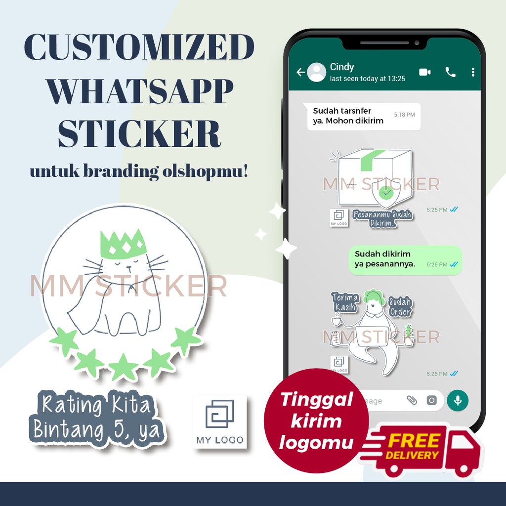 Tingkatkan branding Olshop kamu dengan koleksi Whatsapp Sticker Custom kami!Design nya lucu, menarik, bikin percakapan dengan customer kamu makin asik dan seru!Cara Pesan:1. Tentukan jumlah sticker yang mau anda beli ( 6/ 8/ 10 sticker). 2. Tuliskan kode design yang anda pilih di “Pesan” saat check out. Lengkapi pula keterangan lainnya yang dibutuhkan sesuai dengan sticker yang anda pilih (Ex: rekening Bank, Order Format, dll). Logo olshop dikirim via chat, bila tidak ada logo ditulis nama Olshop saja. 3. Tidak bisa custom design. Tidak bisa ganti warna maskot. Design yang dikirim sesuai dengan gambar. Bisa request ganti tulisan (FREE) asal kata-katanya tidak panjang sebab space terbatas.4. Setelah sticker dikirim, bisa revisi MAX 1x. Revisi berupa revisi kata-kata/ukuran tulisan. Tidak bisa ganti design dan ganti warna.6. Sticker akan dikirim langsung ke WA anda Max. 48 jam. Tidak perlu download aplikasi apapun. Ongkir sudah termasuk!7. Happy Shopping! Chat kami bila ada pertanya