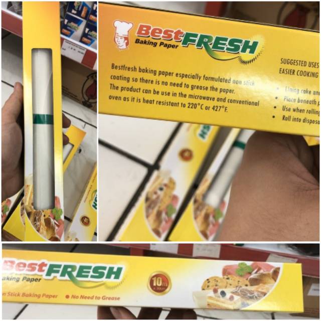 Ukuran 1 Roll lebar 30cm x panjang 10 meterMerk Best FreshMengapa menggunakan baking paper?- Hasil pemanggangan menjadi lebih sempurna- Hasil kukusan menjadi lebih baik- Loyang panggang / wadah kukus tidak menempel dengan makanan (Kue, Roti, Biscuit, Ayam, dan bahan makanan lainnya)- Makanan mudah dikeluarkan dari wadah kukus / loyang panggang- Berbahan Food Grade, sehingga aman dan dapat menjaga kualitas kebersihan dari makanan yang dipanggang atau dikukus.- Untuk menggulung sekaligus membungkus bolu gulung.- Dapat digunakan berulang kali, tergantung pemaka
