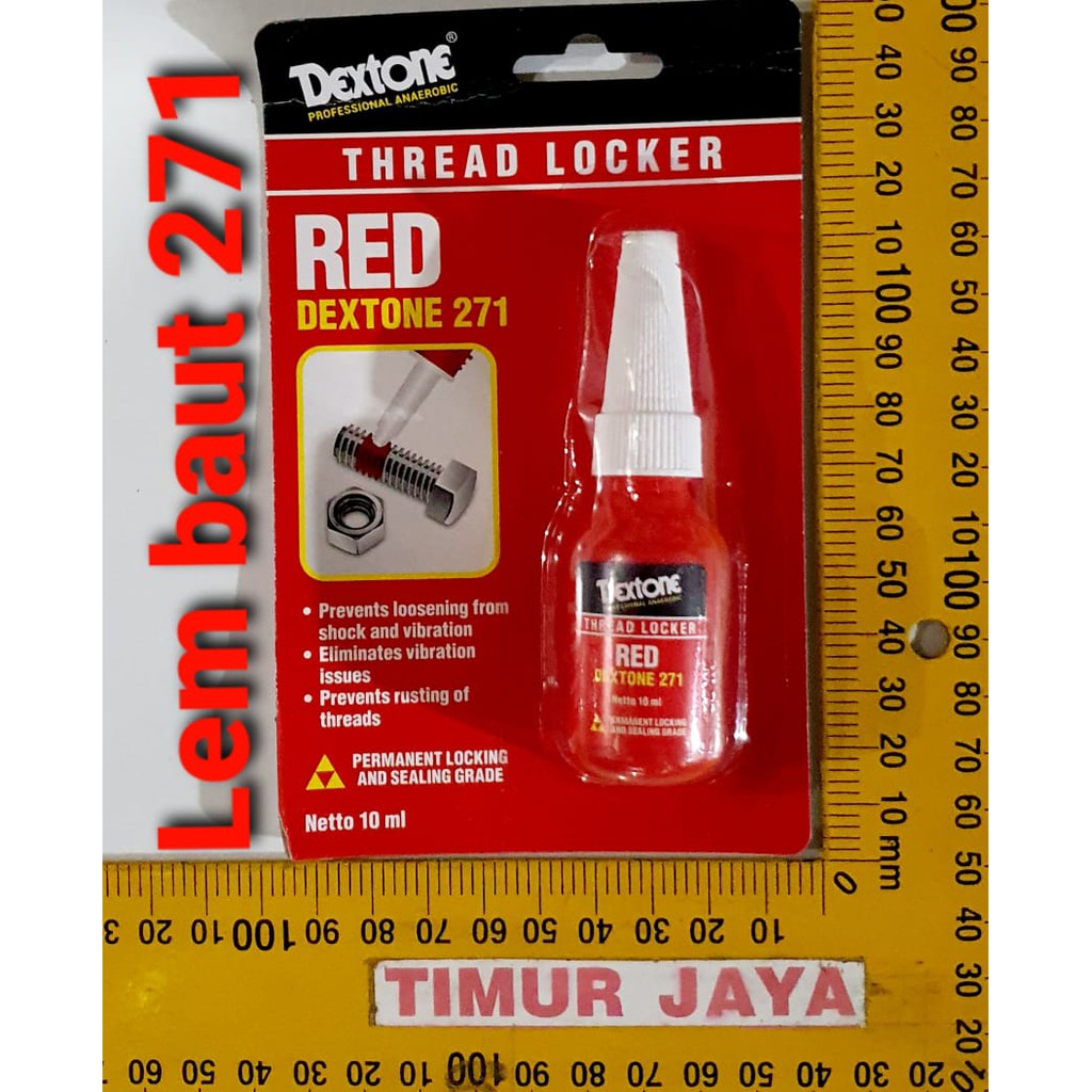Dextone Threadlocker merupakan Cairan kimia anaerobic tunggal yang mengeras ketika tidak ada udara antara 2 permukaan metal seperti baud.digunakan untuk pengunci ring atau baud.Ukuran 10mlKegunaan Untuk baud ukuran hingga 1" (25mm) (M25), High Strength LockingWarna MerahKekuatan :TinggiViskositas :500 cpsDensitas :1.1 gr/mlTemperatur :-54 C - 155 CTorsi untuk Buka :32 Nmwaktu kering lem :