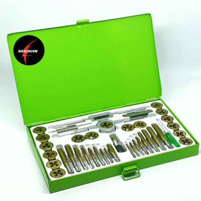 Tap dan senai merupakan alat-alat yang digunakan untuk membuat ulir luar dan ulir dalam dengan menggunakan tangan. Tap sendiri digunakan untuk pembuatan ulir dalam yaitu untuk pembuatan mur sedangkan senai digunakan untuk pembuatan ulir luar yaitu untuk membuat baut.HARGA DIATAS ADALAH HARGA PER SET ( 40 PCS )TERDIRI DARI :- 17 PCS DIES SIZE : M3*0.5 , M4*0.7, M5*0.8, M6*1.0, M7*1.0, M8*1.25, M10*1.5, M12*1.75, 1/8NPT27, 4NC40, 6NC32, 8NC32, 1/4NC20, 5/16NC18, 3/8NC16, 7/16NC14, 1/2NC13.- 17 PC TAP : SIZE AS DIES- TAP WRENCH- DIE HANDLE : 1"OD- T-TYPE WRENCH 1/4" CAPACITY- SCREWPITCH GAUGE- SCREWDRIVERKODE : GT-TD1726- Manufactured From Alloy Steel, Packed in Steel Box- Heat Treated And Hardened- Precision Ground.Bahan terbuat dari Chrome Vanadium. (CrV)Keunggulan dari Chrome Vanadium. (CrV) adalah Chrome memberikan tampilan mengkilap pada produk tools, sementara Vanadium memberikan kekuatan dan tahan k