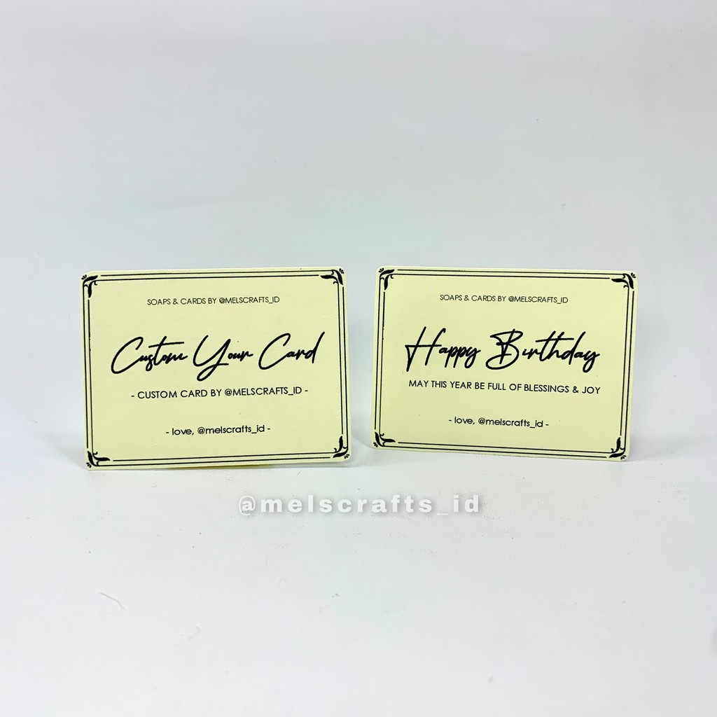 • c u s t o m w i s h c a r d •ever want to make your gifts more personalized ? to give it a more personal touch to it ?well, we have the perfect solution for you !! with a price at only IDR 5k, you can get a customized card specially for your loved ones to go with our soaps !!simply type your wishes in the description section during checkout or just chat us !! we will be glad to assist any inquiries ❤️- love, @melscrafts