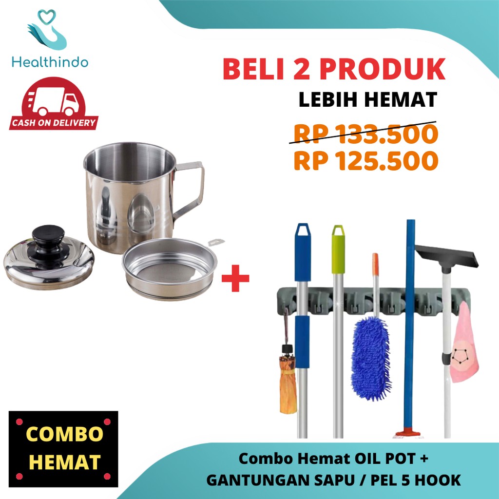 PAKET HEMAT Oil Pot Wadah Saringan Minyak Goreng + Gantungan Sapu Gantungan Pel Alat Pel Mop holder 5 Slot1. OIL POTMenggoreng makanan dengan minyak goreng tentunyamasih ada bekas penggorengan yang masih sisa didalam minyak di wajan penggorenganpada umumnya ibu-ibu rumah tangga melakukan penyaringan bekas minyak goreng agar minyak,tetap bening dan baik..Kini hadir Oil Pot tempat penyaringan minyak serbaguna Berbahan teflon non stick anti karat , anti bau memudahkan ibu-ibu dalam hal penyaringan minyak bekas penggorengan dilengkapai tutup dan saringan anti karat..Oil Pot Selain memiliki fungsi sebagai penyaringan minyak goreng alat ini memiliki banyak fungsi / penyaring serbaguna bisa juga sebagai saringan teh,saringan rebusan jamu herbal,saringan kelapa(santan),dan lain-lainDeskripsi:1. Oil pot ini dilengkapi dengan penyaring yang berfungsi untuk menyaring kotoran minyak dan lemak. Memiliki mesh filter atau saringan halus sehingga tidak dapat ditembus oleh sisa-sisa makanan kecil dilengkapi dengan tutup dan kedap udara untuk menyimpan di lemari es atau pantry.2. Oil pot ini sangat cocok untuk menyimpanan minyak yg telah digunakan agar tetap bersih and fresh.3. Oil pot ini terbuat dari stainless steel kualitas terbaik sehingga tahan lama.4. Oil pot ini sangat cocok juga sebagai gift buat para ibu rumah tangga.5. Oil pot ini sangat mudah di simpan dan dibersihkan6. Kapasitas: 1.1 liter7. Size : 12 cm2. GANTUNGAN SAPU / MOP HOLDER 5 SLOTUkuran : 41cm x 7 x 6,5 cmBahan: plastik PPWarna : Abu-abuTerdiri dari :* 5 slot anti slip ( tinggal di selip aja tongkat sapu/ pel atau lain2 )* 5 gantungan ( bisa untuk gantung kain, lap dan lain2 ) --Simpan dan tata sapu, alat pel dan alat kebersihan lainnyadi Magic Hanging Holder 5 Slots ini.Dengan alat ini sapu kamu gak jadi cepat lebardan kain pel jadi lebih cepat kering karena digantung dengan benar.☑ Konstruksi plastik ringan tapi tahan lama.☑ Bola putar yang unik ini memegang dengan kencang sesuai ketebalan gagang sapu.☑ Bantalannya terbuat dari karet anti slip sehingga gagang sapu tidak bergeser.☑ Di desain dengan kokoh untuk digantung di dinding rumah.☑ Tersedia skrup untuk dan instalasi mudah dan cepat.☑ Pas untuk penyimpanan dan penataan sapu, alat pel, dan alat kebersihan lainnya.☑ Pas untuk jadi tempat penyimpanan di dapur, tempat cuci, basement atau garasi.--Yuk diorder