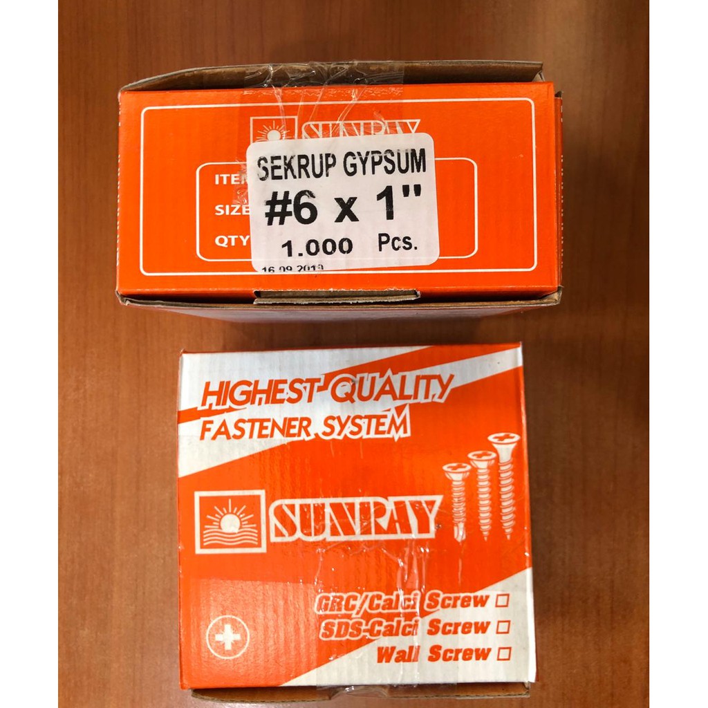 Skrup gypsumMerk : SUNRAYUkuran : 6 x 1" (2,5cm)Isi per dus : 1.000 buahHarga yg tertera merupakan harga / dus (1.000 bh)KETENTUAN PENGIRIMAN BARANG: (Hari Minggu TIDAK ADA pengiriman barang)- Via Ekspedisi = Jam 15.00 WIB setiap harinya (order yg masuk lewat dari jam tersebut, akan dikirim hari berikutnya)- Via Gojek / Grab Sameday = Request pick up terakhir jam 14.00 WIB (lewat dari jam tersebut, akan diproses hari berikutnya)- Order yg masuk hari Sabtu & lewat dr jam 15.00 WIB akan diproses hari Senin, dikarenakan hari minggu toko
