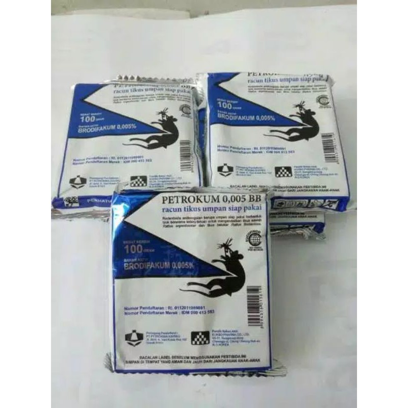 Mohon Maaf, J&T tidak menerima pengiriman barang mengandung RACUN dan BATTERY ke LUAR PULAU JAWA, Silahkan pilih/menggunakan ekspedisi lain.Petrokum atau permen tikus merupakan RACUN TIKUS 0,005 BB yang siap pakai, berbentuk kotak- kotak kecil- Sangat ampuh untuk tikus rumahan, perkebunan, sawah,- Petrokum tidak perlu di campur dengan makanan.- Sangat praktis dan mudah digunakan.- Tikus mati kering dan tidak berbau.Cara Pengunaan :1. Gunakan sarung tangan plastik / plastik biasa juga bisa, tangan harus tertutup plastik, ( jangan sampai terkena )petrokumnya karena tikus biasanya tidak mau makan permen tikusnya karena sudah tercemar oleh tangan kita.2. Potong permen tikus (Petrokum ) sesuai keinginan.3. Ambillah permen tikus (Petrokum) sesuai kebutuhan 4. Tebar Petrokum di tempat-tempat yang di inginkan atau yang sering di lalui oleh tikus.keterangan 1 Kotak isi 10 bungkus @ 100 gramHARGA YANG TERTERA ADALAH HARGA 1 BUN