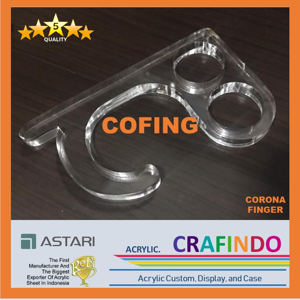 eskripsi COFING (Corona Finger) Alat Bantu Tanpa Sentuh NEW NORMAL Akrilik 5MMDeskripsi New Corona Finger - BeningWASPADA terjangkit COVID-19 akibat sentuhan permukaan yang terinfeksi VIRUS!!.Virus corona. Virus dapat bertahan lama di benda mati Maka dari itu kami merilis NEW CORONA FINGER.Alat serba guna, salah satu gunanya untuk alat bantuan kalian agar terhindar dari virus corona. NEW COFING (Corona Finger) mempunyai spesifikasi produk:Acrylic Bening: tebal 5 MM- teridapat 2 lubang untuk jari agar gengaman semakin kuat dan tidak membuat jari sakit- terdapat hook yang sangat kuat untuk menyangkutkan ke berbagai bidang seperti handle pintu, kantung belanjaan, dan lain lain.- terdapat penunjuk yang berfungsi sebagai alat tekan pengganti jari.NEW COFING didesign secara ergonomis, dengan bentuk yang trendi..cocok untuk kaum adam dan hawa, ramah terhadap anak2 dan lansia.mudah dibawah kemana-mana...Selain bermanfaat, praktis, dan trendi,, yang terpenting adalah harganya yang ramah di kantong!!New COFING dengan design baru dan harga yang lebih bersahabat..cocok sebagai souvenir untuk orang-orang yang terkasih!!cepat miliki NEW COFING sebelum kehabi
