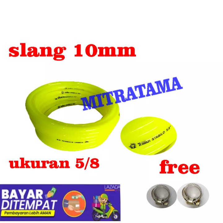 Nama barang : selang airUkuran : 5/8" 10 meterMerek : triliun stabiloCocok untuk keperluan anda dalam :• menyiram tanaman • mencuci mobil/motor • dllSelang triliun dop adalah selang berkualitas bagus, tidak mudah rusak , elastis/tidak kaku.Tersedia warna hijau