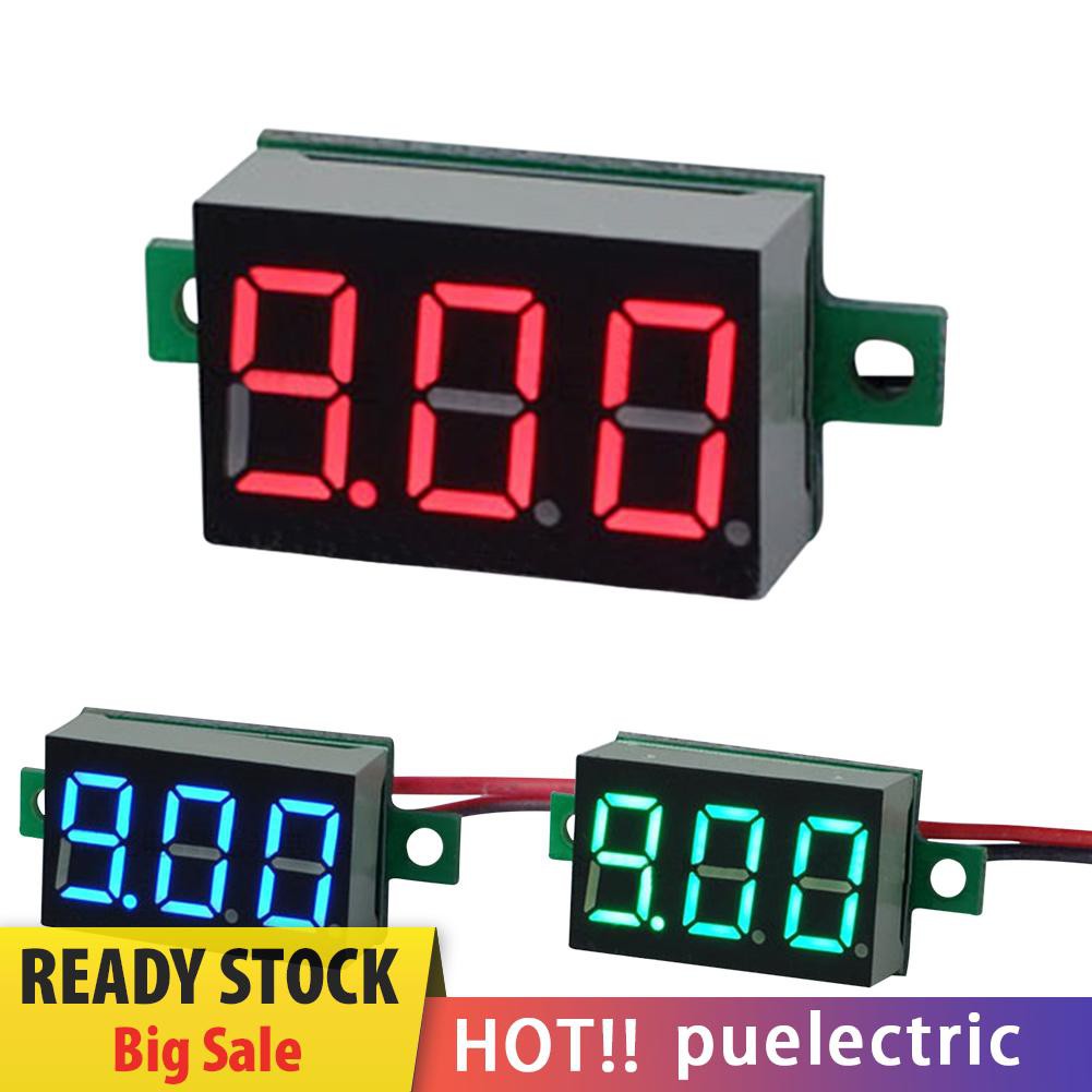 ☞Welcome to puelectric, our products guarantee the quality, please rest assured to buy, I wish you have the most enjoyable shopping experience.Features:1. The wire connection is simple, only need to connect two wires, the red line connect the anode, the black line connect the cathode. Inside the voltmeter, there are reverse polarity connect protection.2. This voltmeter work without external power supply, can use the measuring voltage directly, Wide working voltage range of 4.5-30V3. For best accuracy of measurement, depending on the measuring voltage, the voltmeter automatically move the position of the decimal point. when voltage is below 10V, it shows two decimal places; when voltage is over 10V, it shows one decimal place.4. The voltmeter can be used in motorcycles, cars etc monitoring battery voltage, grasps the battery state timely. can also be used for other voltage measurement purposesSpecifications:Shape size: 33 X 15 X 10mmMeasuring range: 4.5-30VHole size: 23 X 15mmThe minimum input: DC4.5V(Less than the minimum voltage, measurement inaccuracies or display)Wire length: 15cmThe maximum input: DC30V(Higher than this voltage, in danger of burning out)Net weight: 5gGross weight: 6g(Package included)Display method: three-digit number 0.36in LED Nixie tubeDisplay color: Red, green, blue optionalUpdate rate: about 200ms/timePower supply: No needCurrent consumption: Less than 20mA, normally 5-15mAWorking temperature: -10~65℃ Included: 1 X Digital Volt